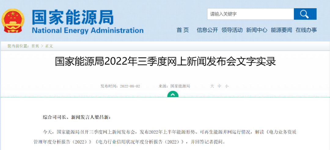 近日,國(guó)家能源局召開(kāi)三季度網(wǎng)上新聞發(fā)布會(huì),發(fā)布2022年上半年能源形勢(shì)、可再生能源并網(wǎng)運(yùn)行情況,并回答記者提問(wèn)。