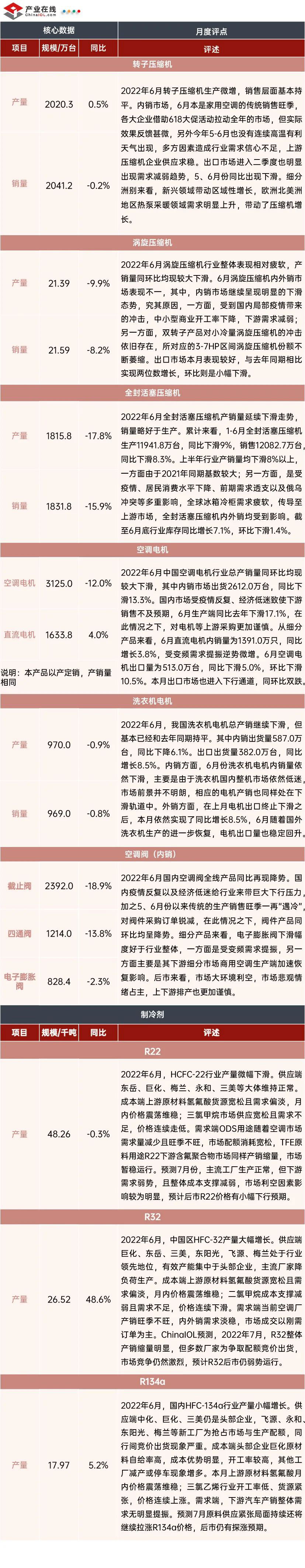據(jù)產(chǎn)業(yè)在線數(shù)據(jù)顯示,2022年6月的產(chǎn)業(yè)鏈?zhǔn)袌?chǎng)依然延續(xù)低迷,疫情動(dòng)態(tài)清零目標(biāo)之下,雖然有多種政策提振,但對(duì)終端消費(fèi)拉動(dòng)效果并不明顯。對(duì)比來(lái)看,中央空調(diào)和空氣源熱泵表現(xiàn)較好;細(xì)分品類(lèi)市場(chǎng)也不乏亮點(diǎn),滾筒洗衣機(jī)、直流電機(jī)等高效節(jié)能產(chǎn)品表現(xiàn)強(qiáng)勢(shì),制冷劑產(chǎn)品中R32出現(xiàn)了近50%的大幅增長(zhǎng)。